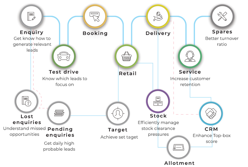 Solution covers each stage in Sales & Service function. Further, there is support in terms of analysis to improve Top-box score and better the spares turnover ratio.